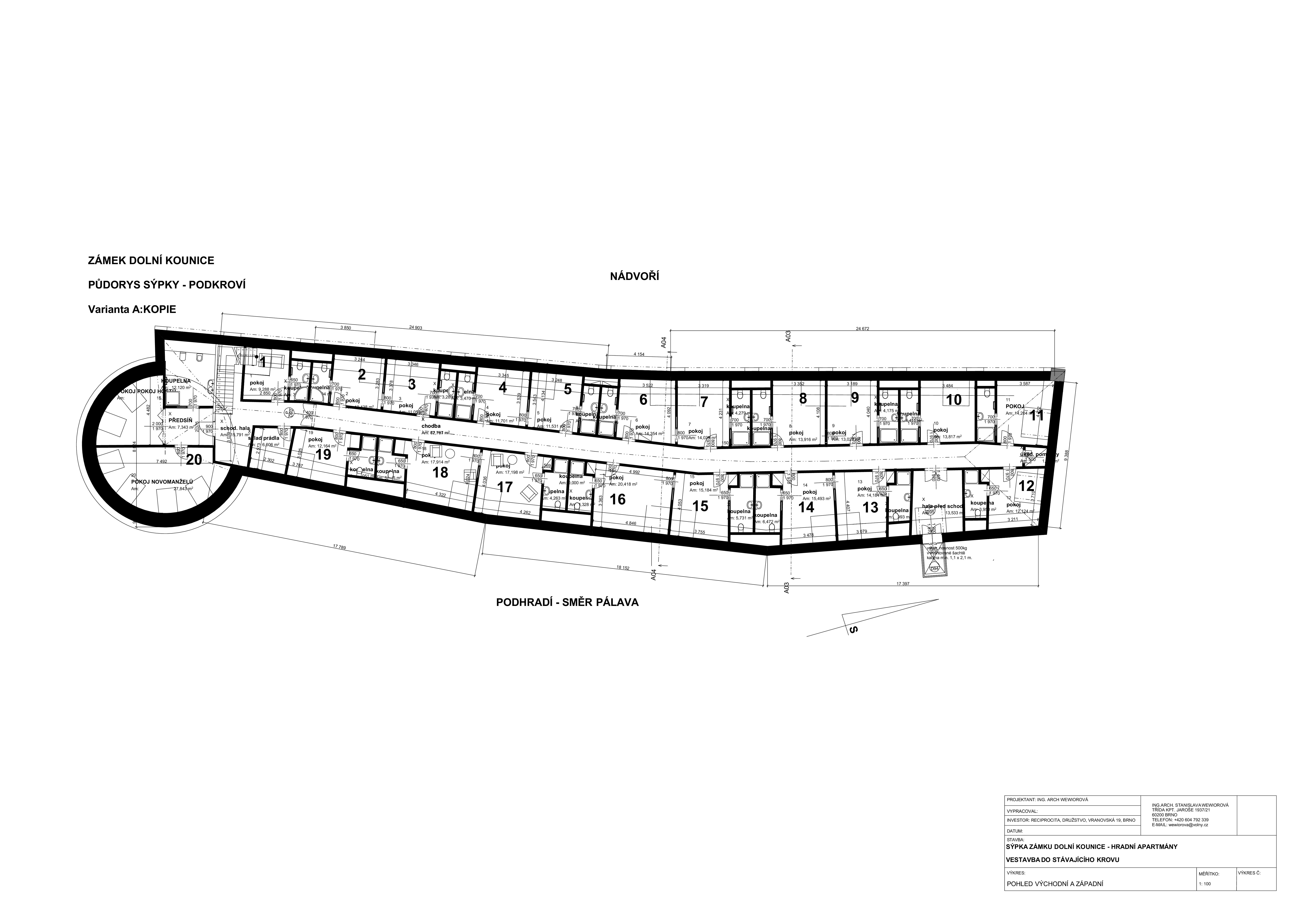 Připravujeme pro Vás pronájem apartmánů na hradě v první etapě v podkroví bývalé dělostřelecké bašty a hradní sýpky. (Na Obr. níže, vlevo je to budova číslo 4). Apartmány budou plně k dispozici od roku 2018. Níže si můžete otevřít soubor, kde je plánek připravovaných apartmánů v podkroví hradu.